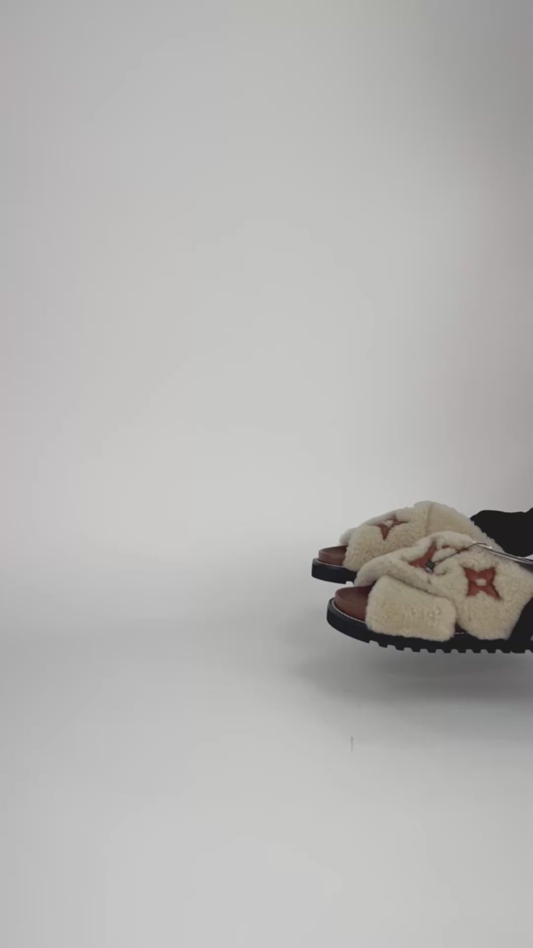 Sandalias Louis Vuitton Paseo Confort con tiras cruzadas en piel y detalle tipo borrega sobre los logos. Un diseño cómodo y sofisticado.