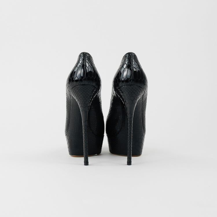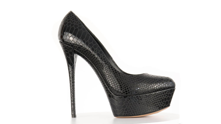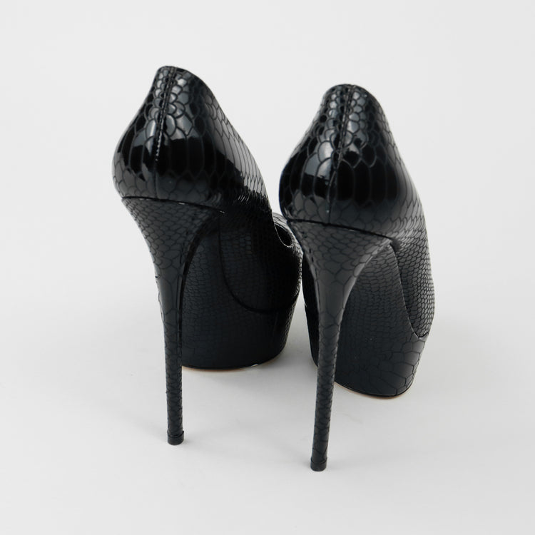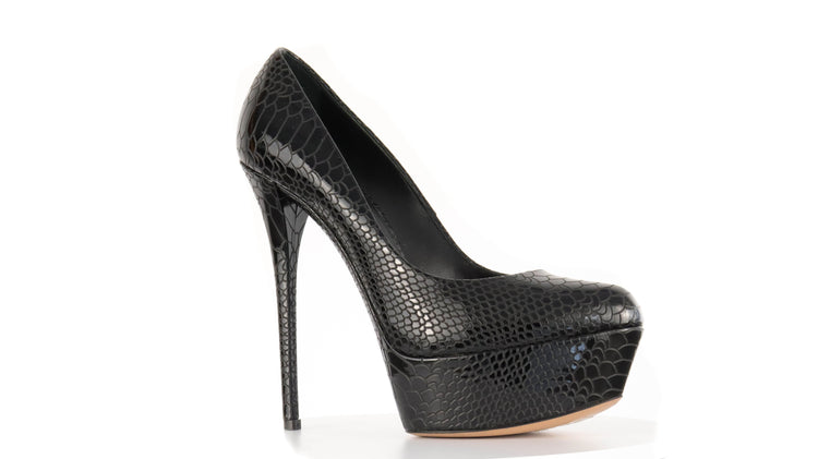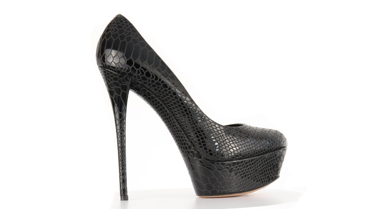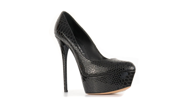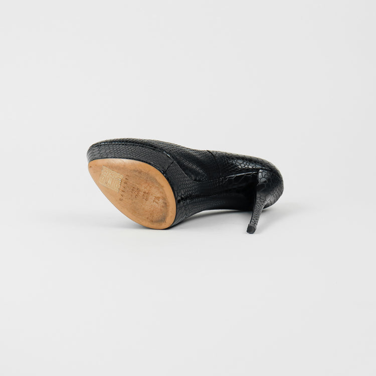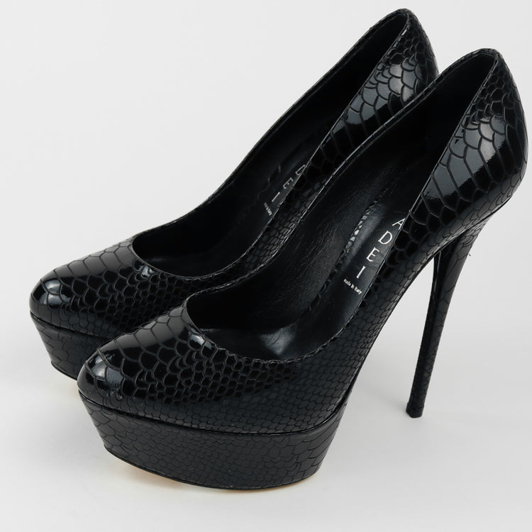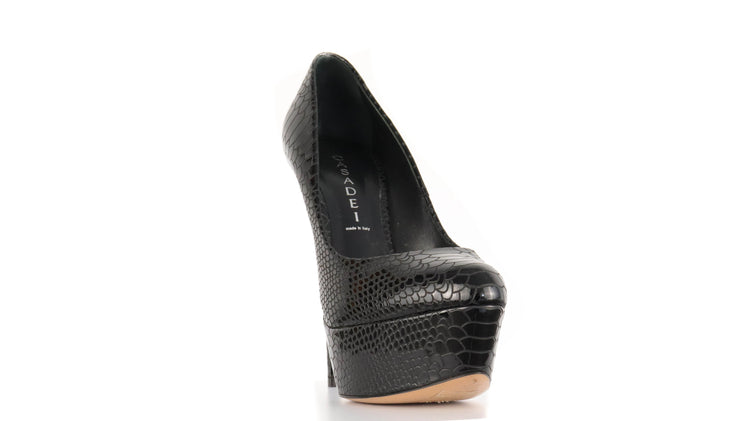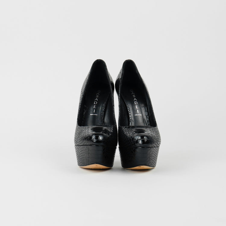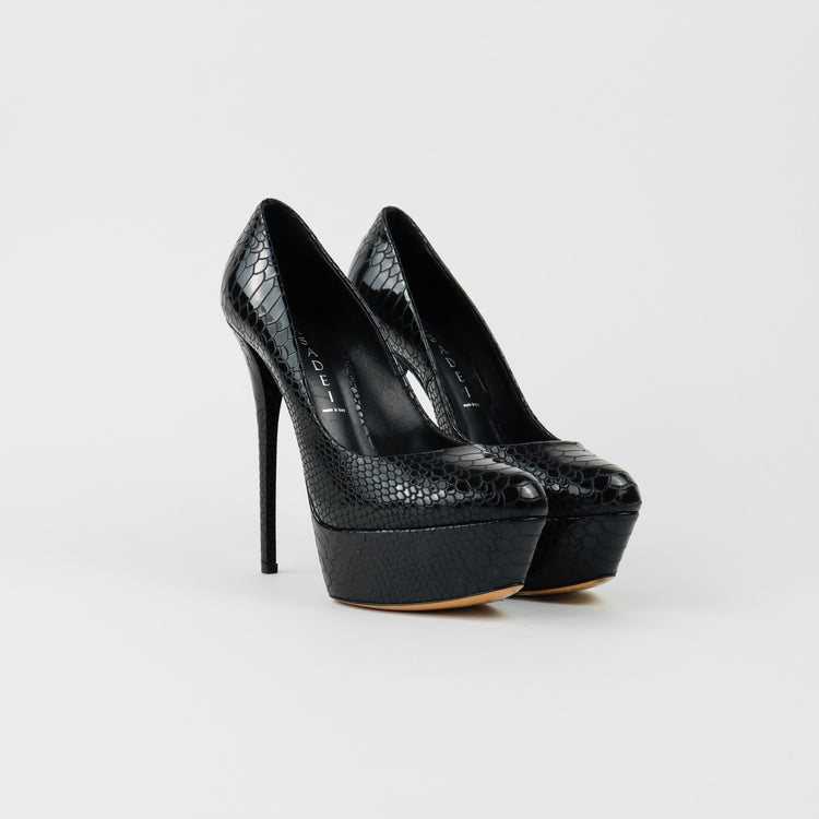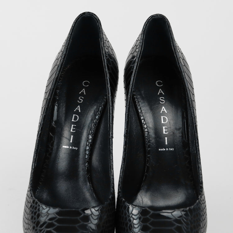 Tacones Casadei, confeccionados en piel color negro, puntera redonda cerrada, con detalles de uso.