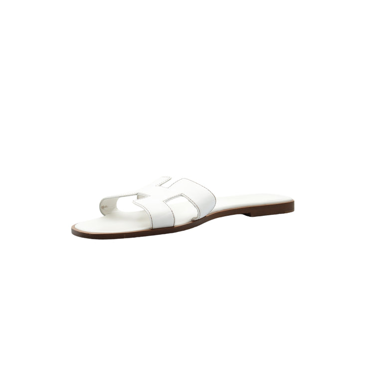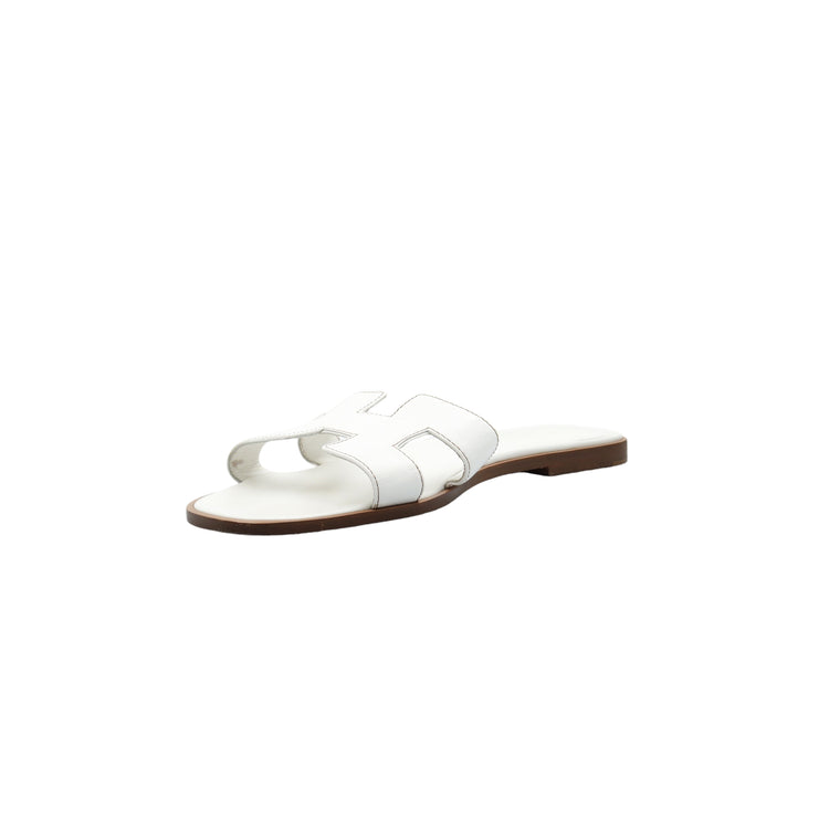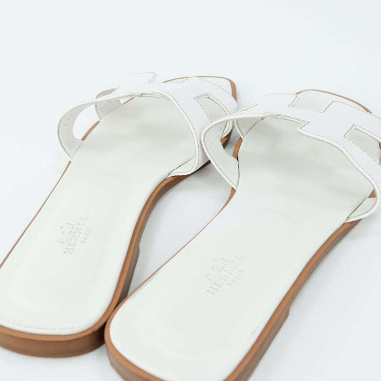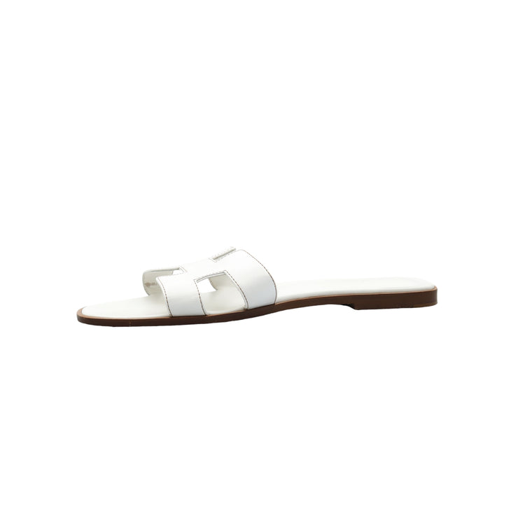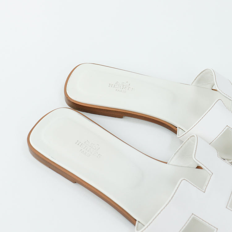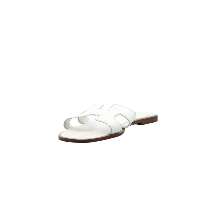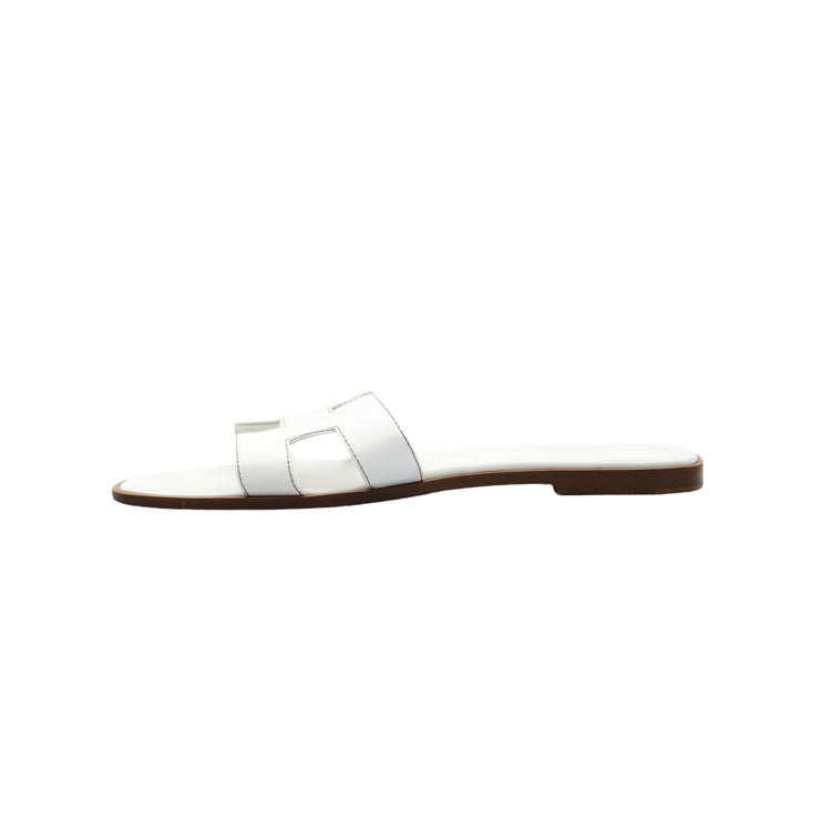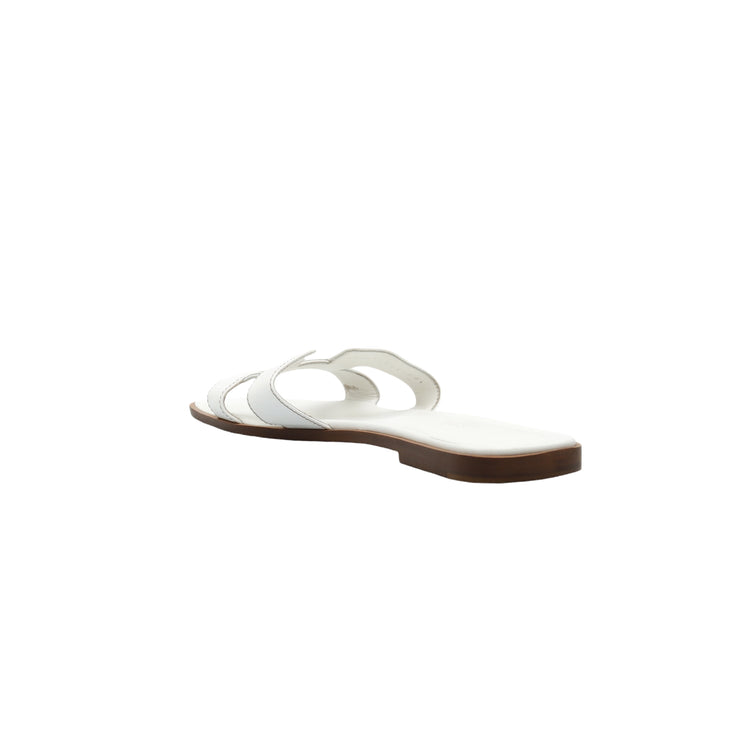 Sandalias marca Hermès, confeccionadas en piel color blanco, con la distintiva "H" de la marca sobre el empeine, con señales de poco uso en empeine y suela.
