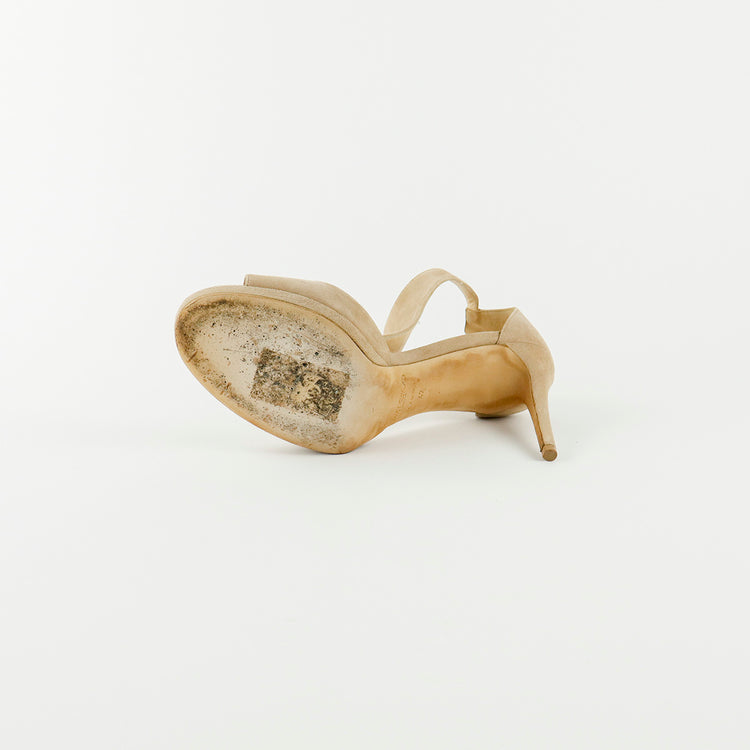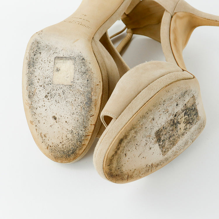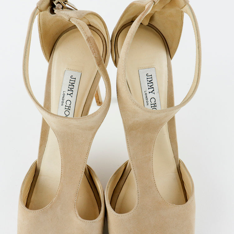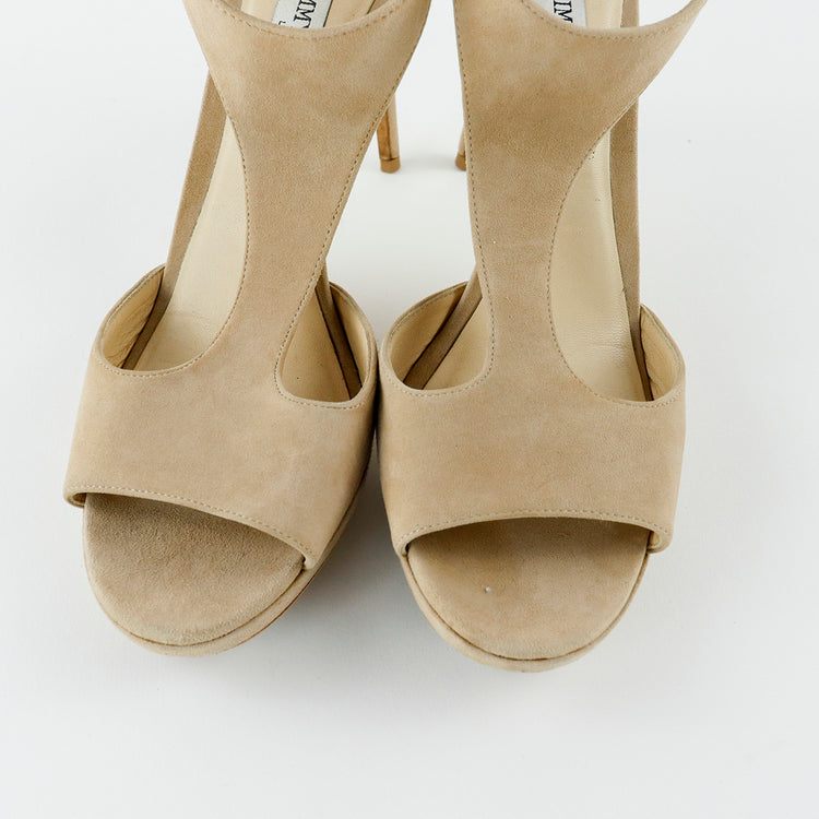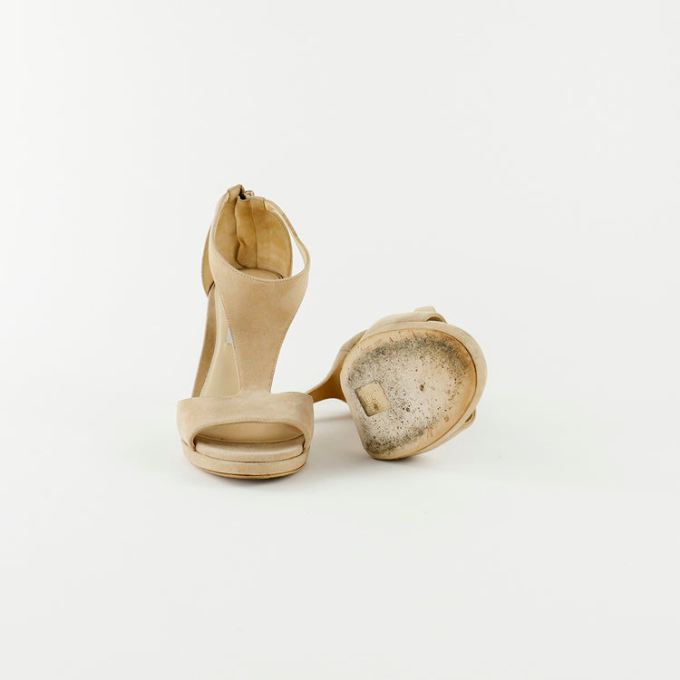 Zapatos de tacón marca Jimmy Choo modelo Lana, confeccionados en gamuza color nude, con ajuste de cremallera en la parte trasera, suela con poco desgaste por uso.
