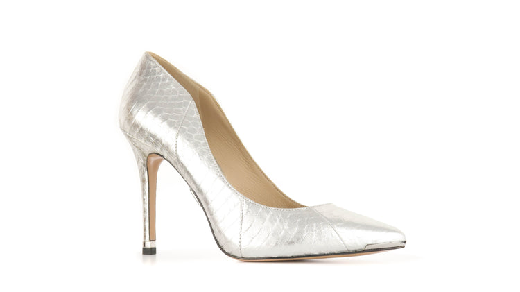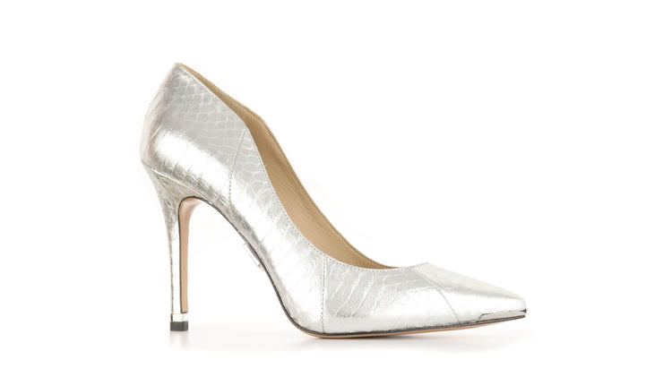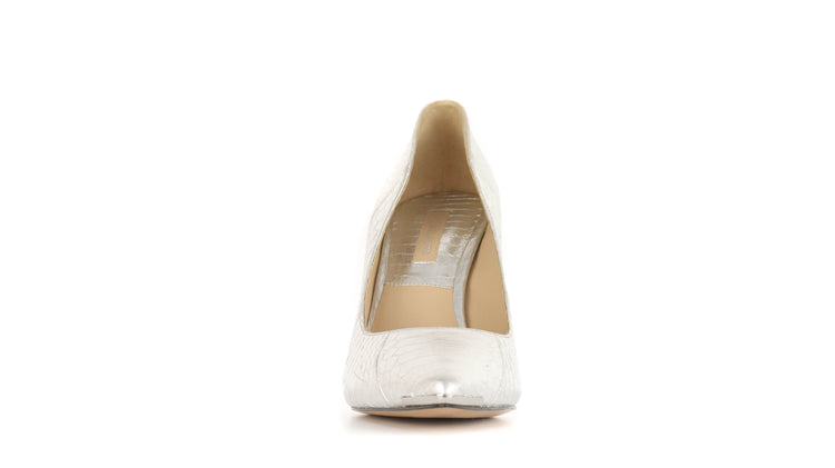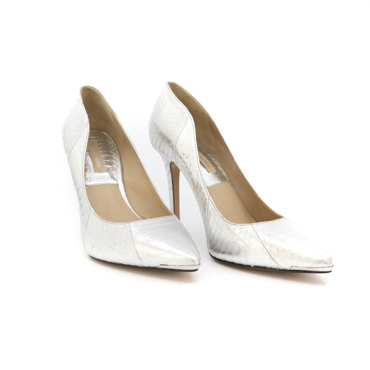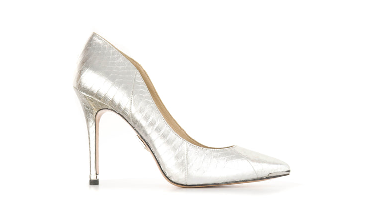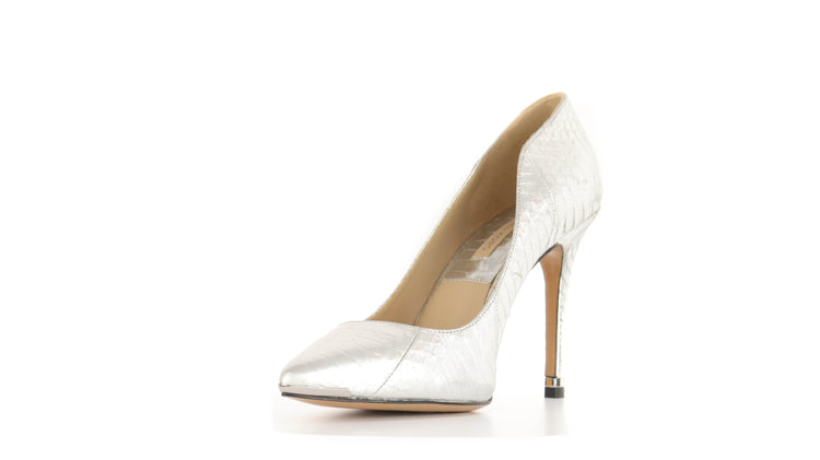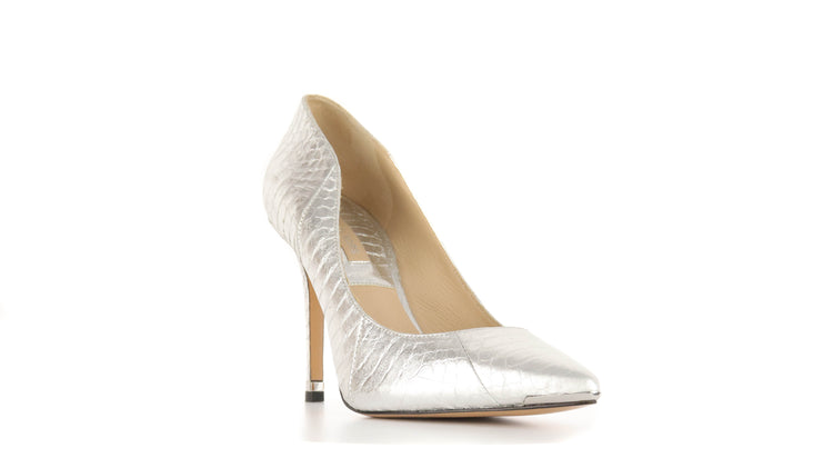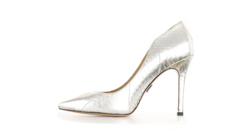 Zapatos de tacón Michael Kors en color plateado confeccionadas en piel tipo víbora y forro en piel de becerro.