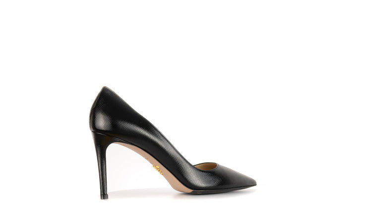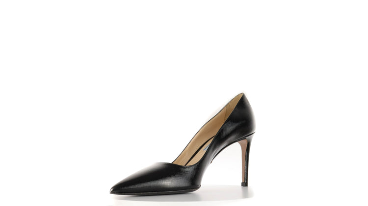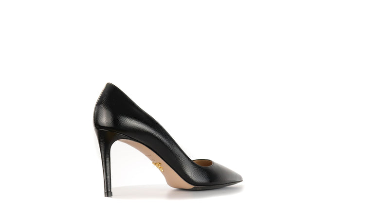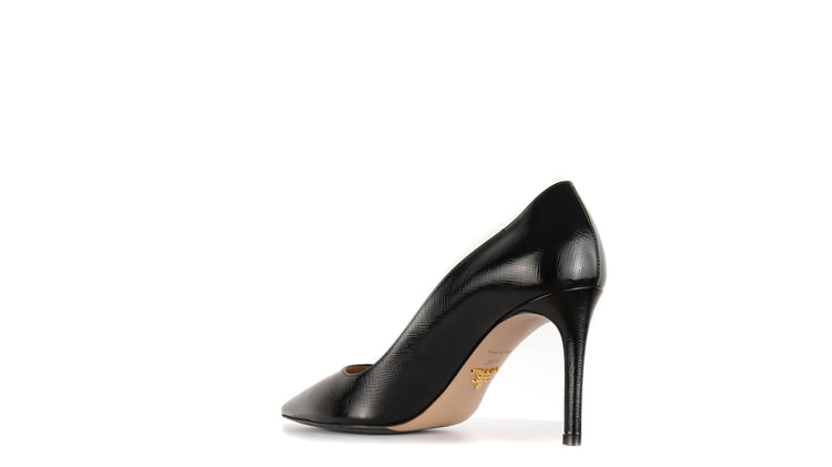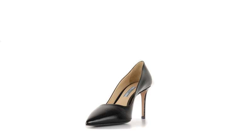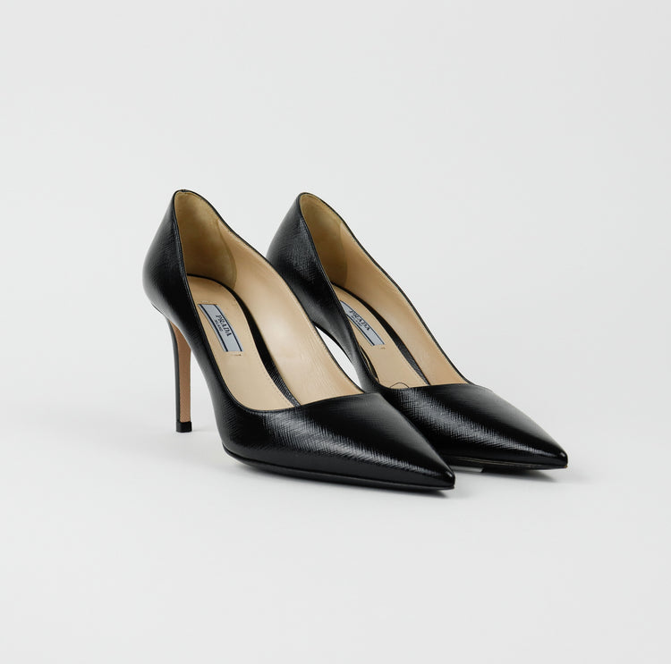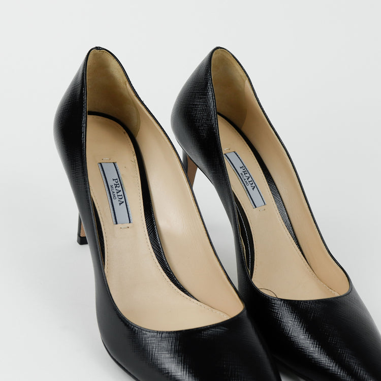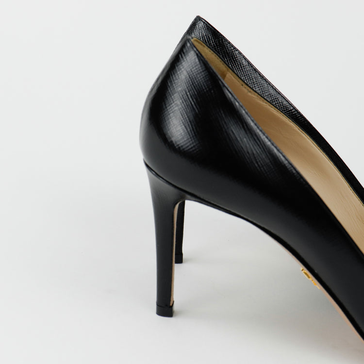 Tacones Prada, elaborados en piel color negro, con puntera en V y tacón mediano.