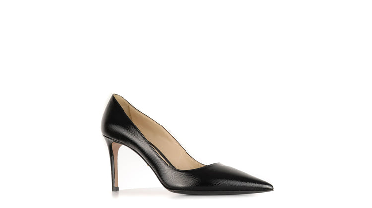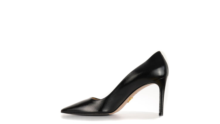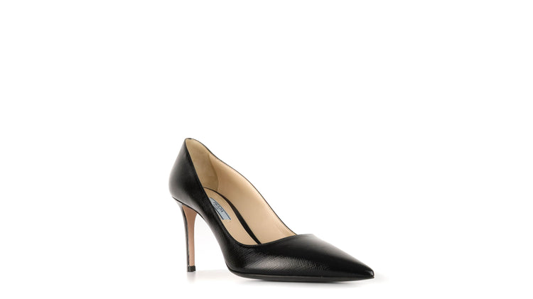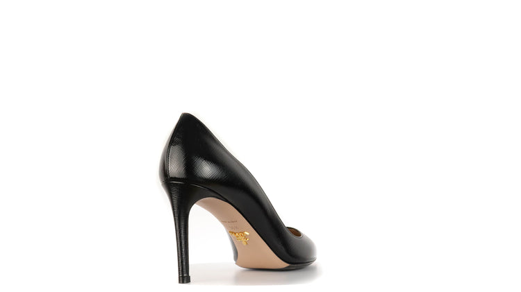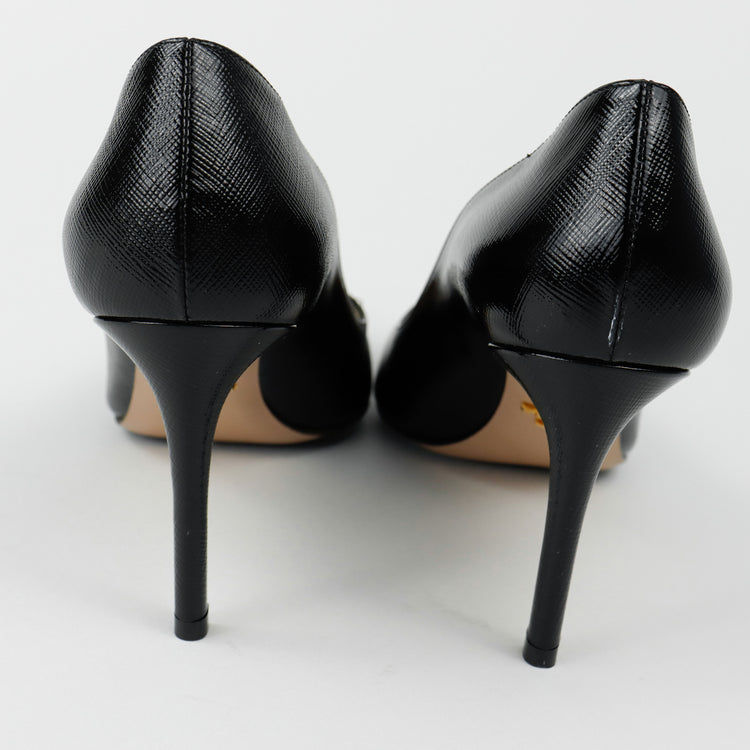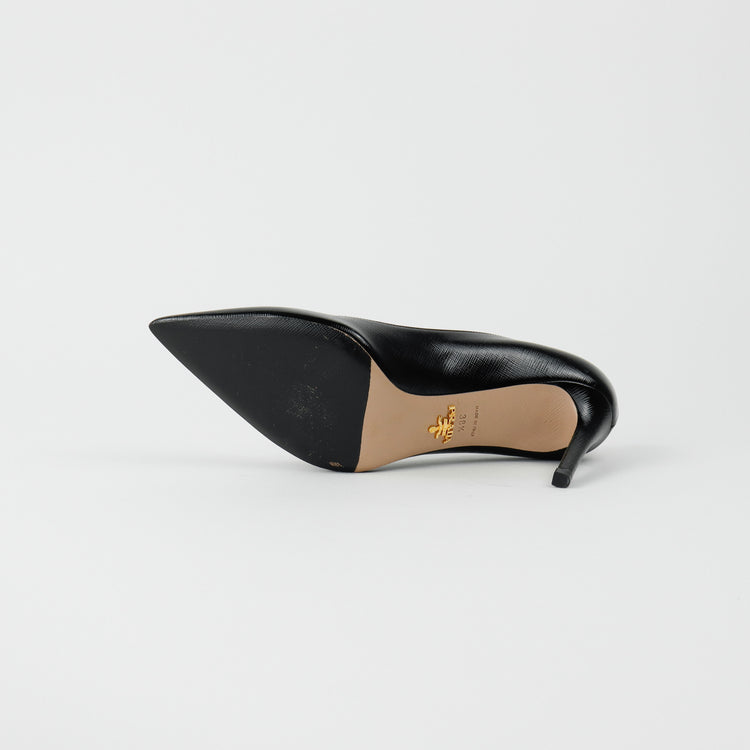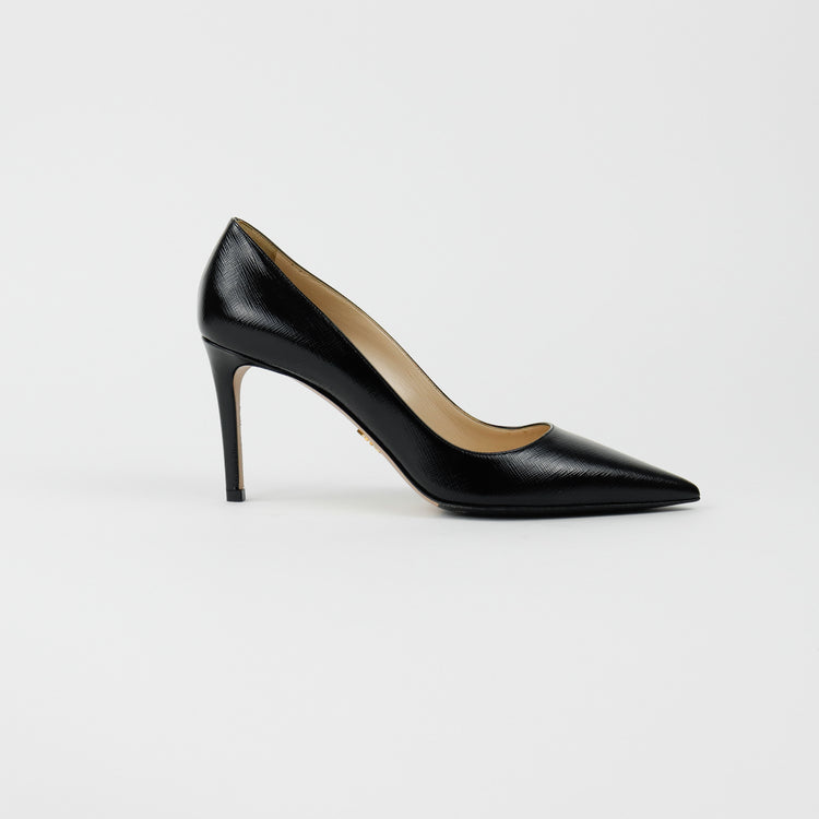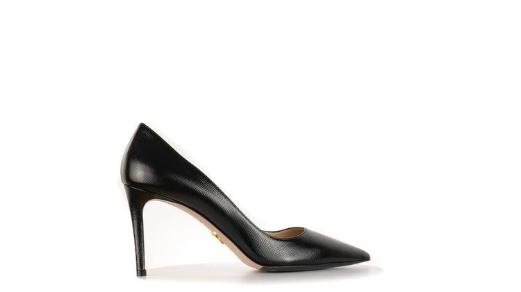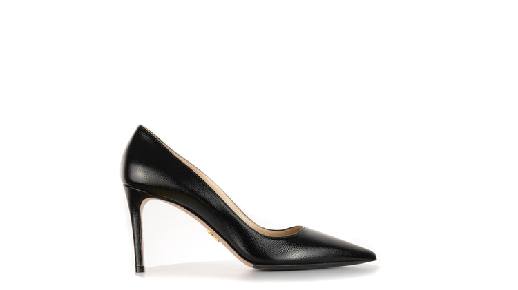 Tacones Prada, elaborados en piel color negro, con puntera en V y tacón mediano.