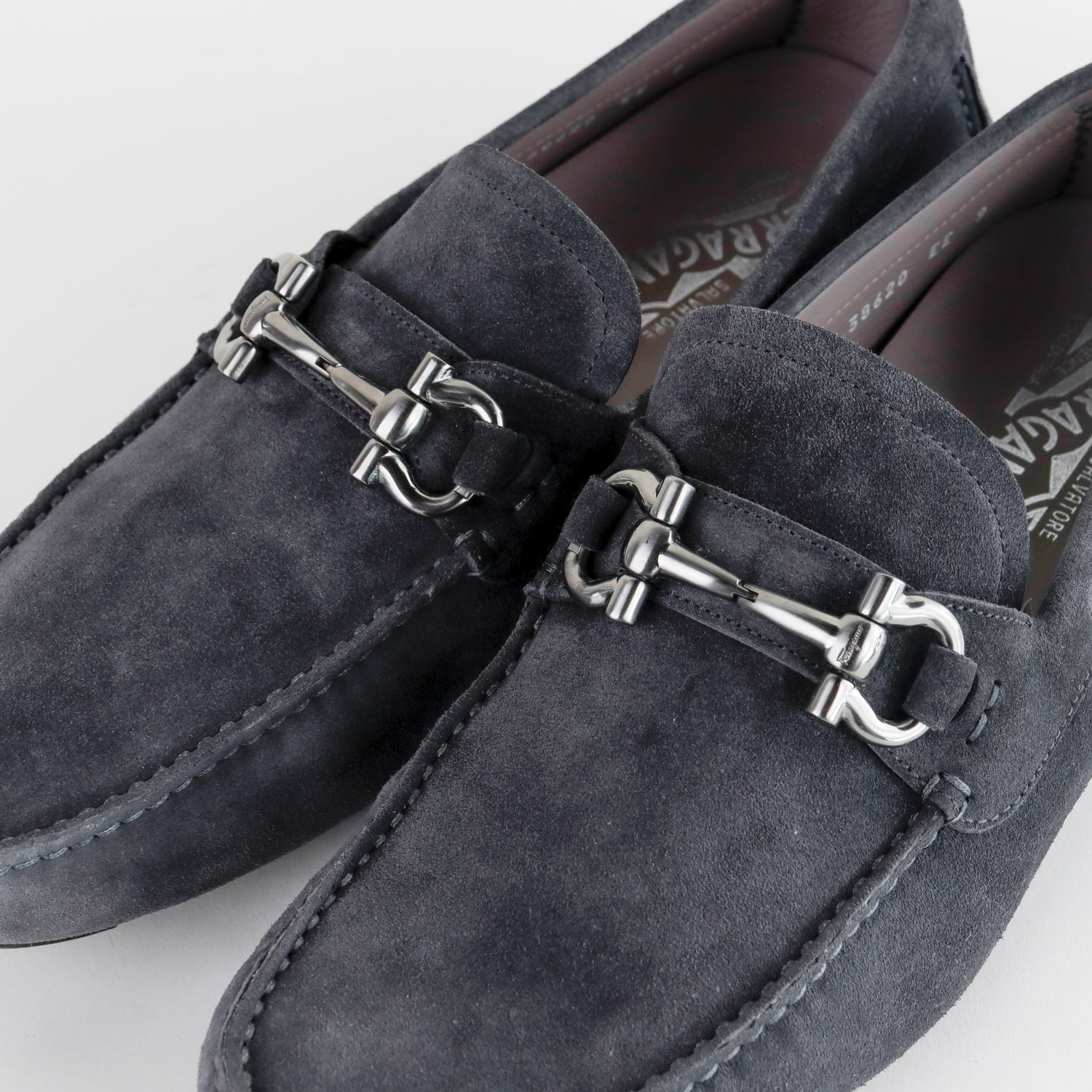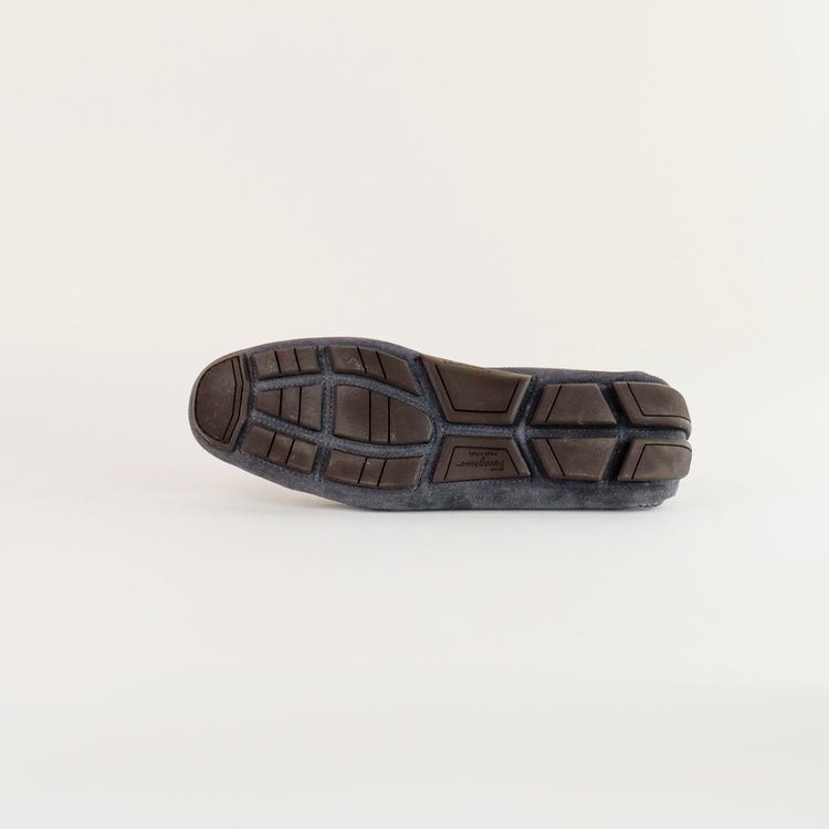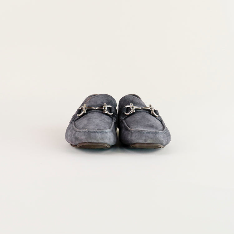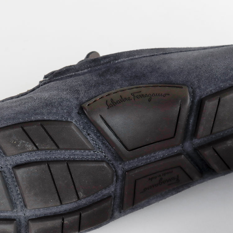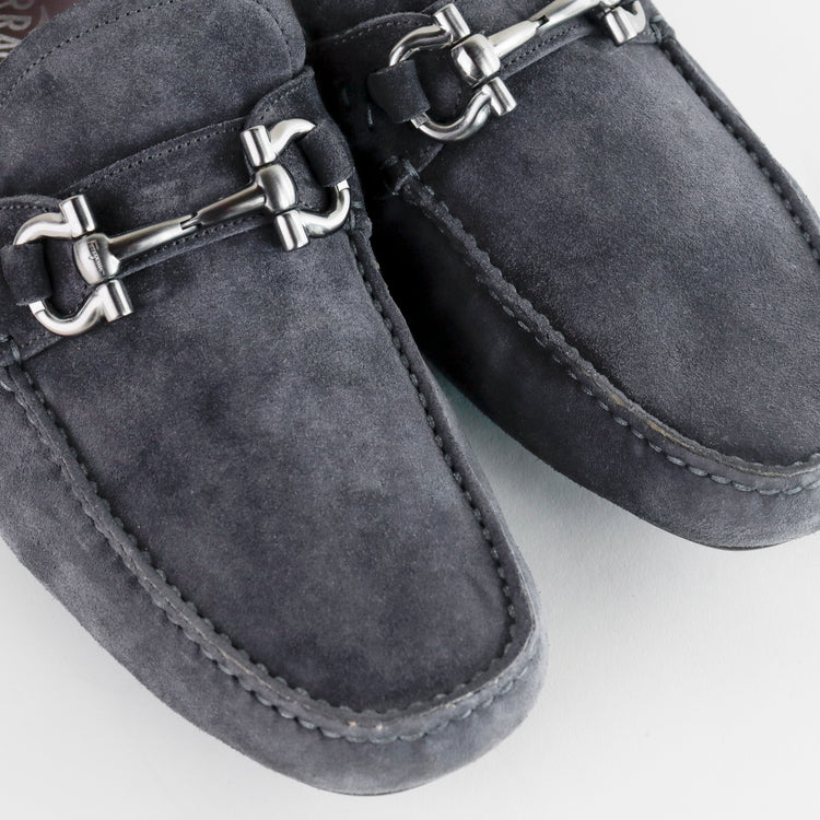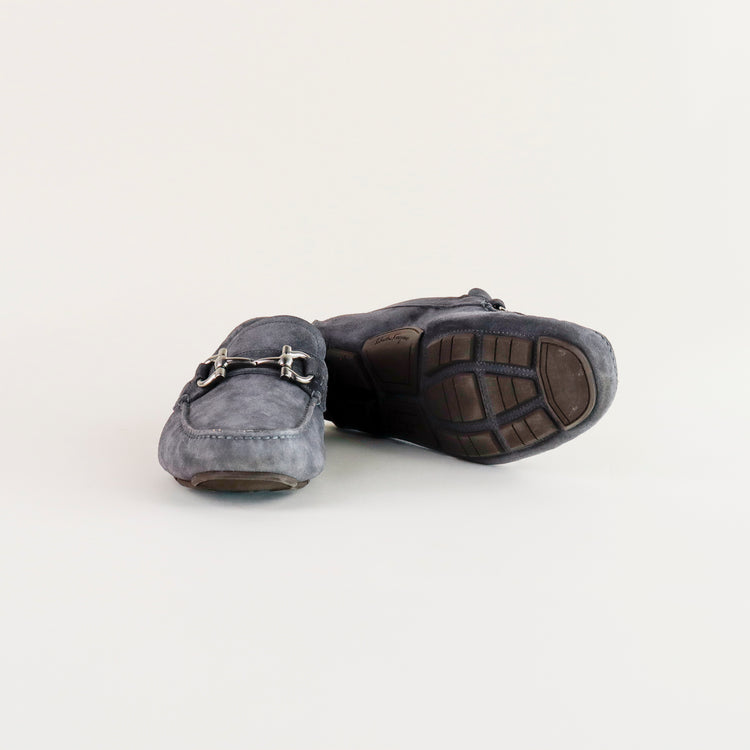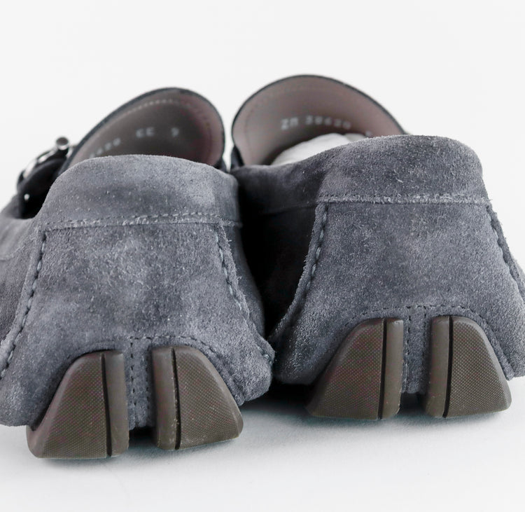 Mocasines Salvatore Ferragamo en gamuza color gris, con distintivo Gancini sobre el empeine, poco uso, cuentan con cubre polvo.