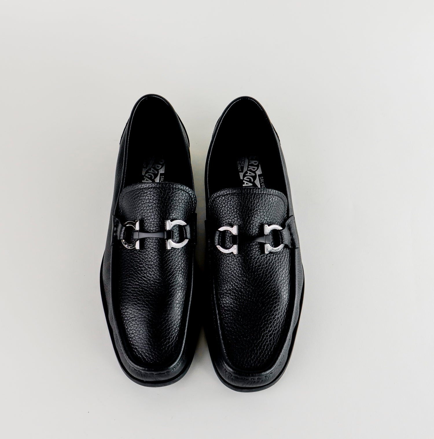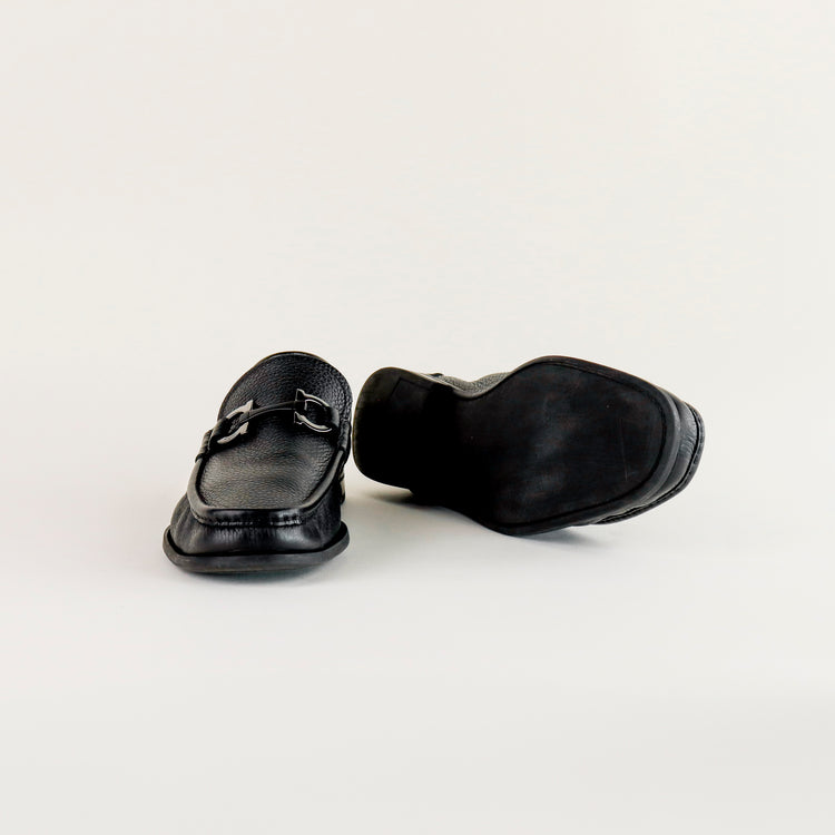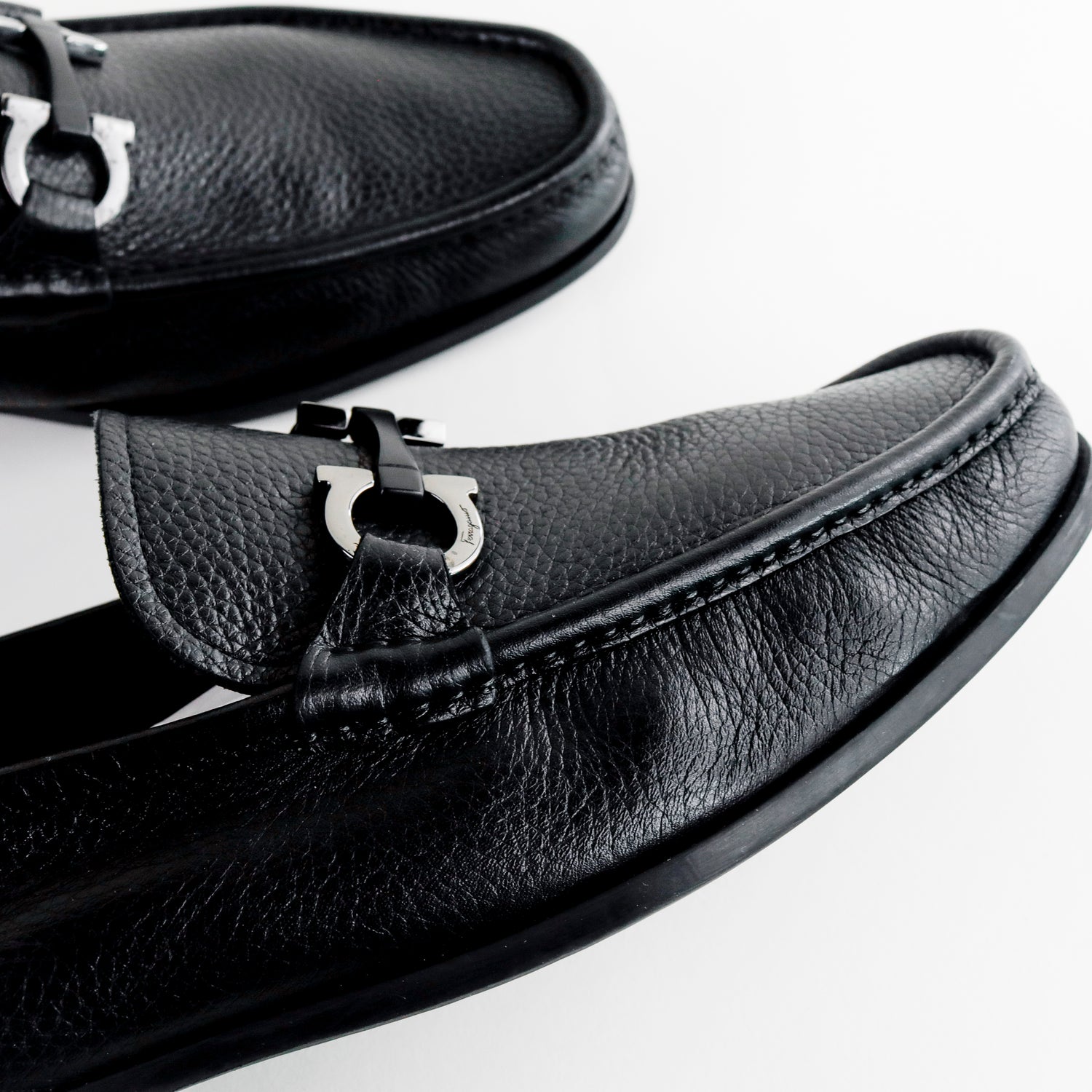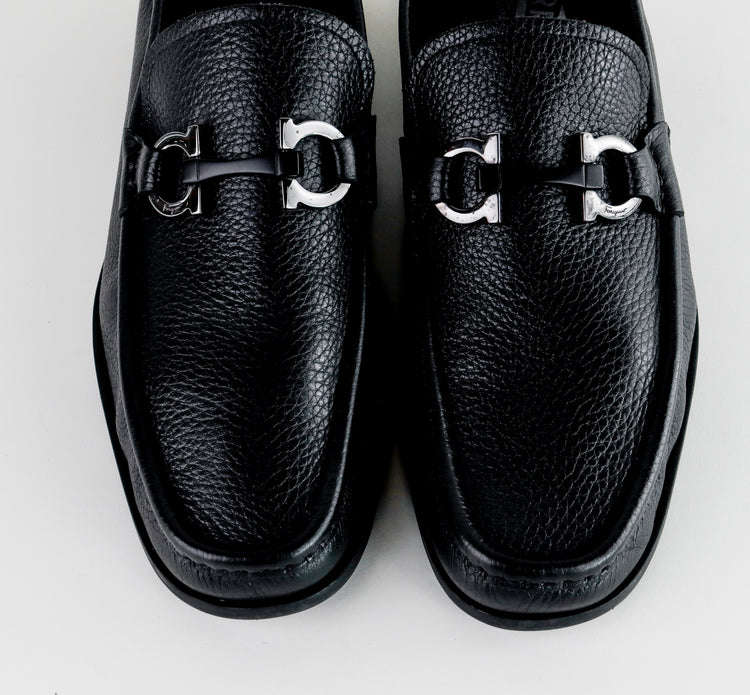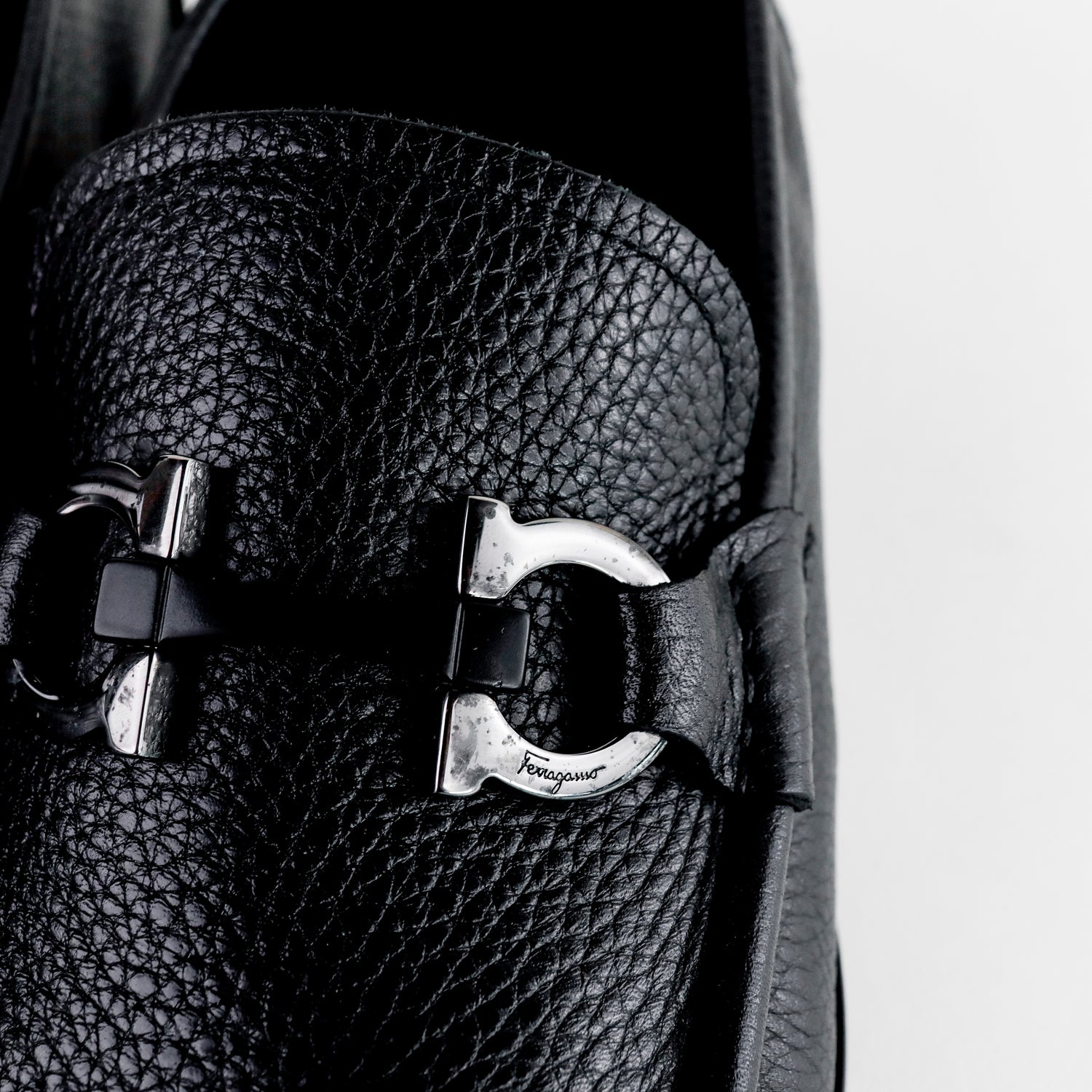 Mocasines Salvatore Ferragamo en piel granulada color negro, con distintivo Gancini sobre el empeine, poco uso, cuentan con cubre polvo.